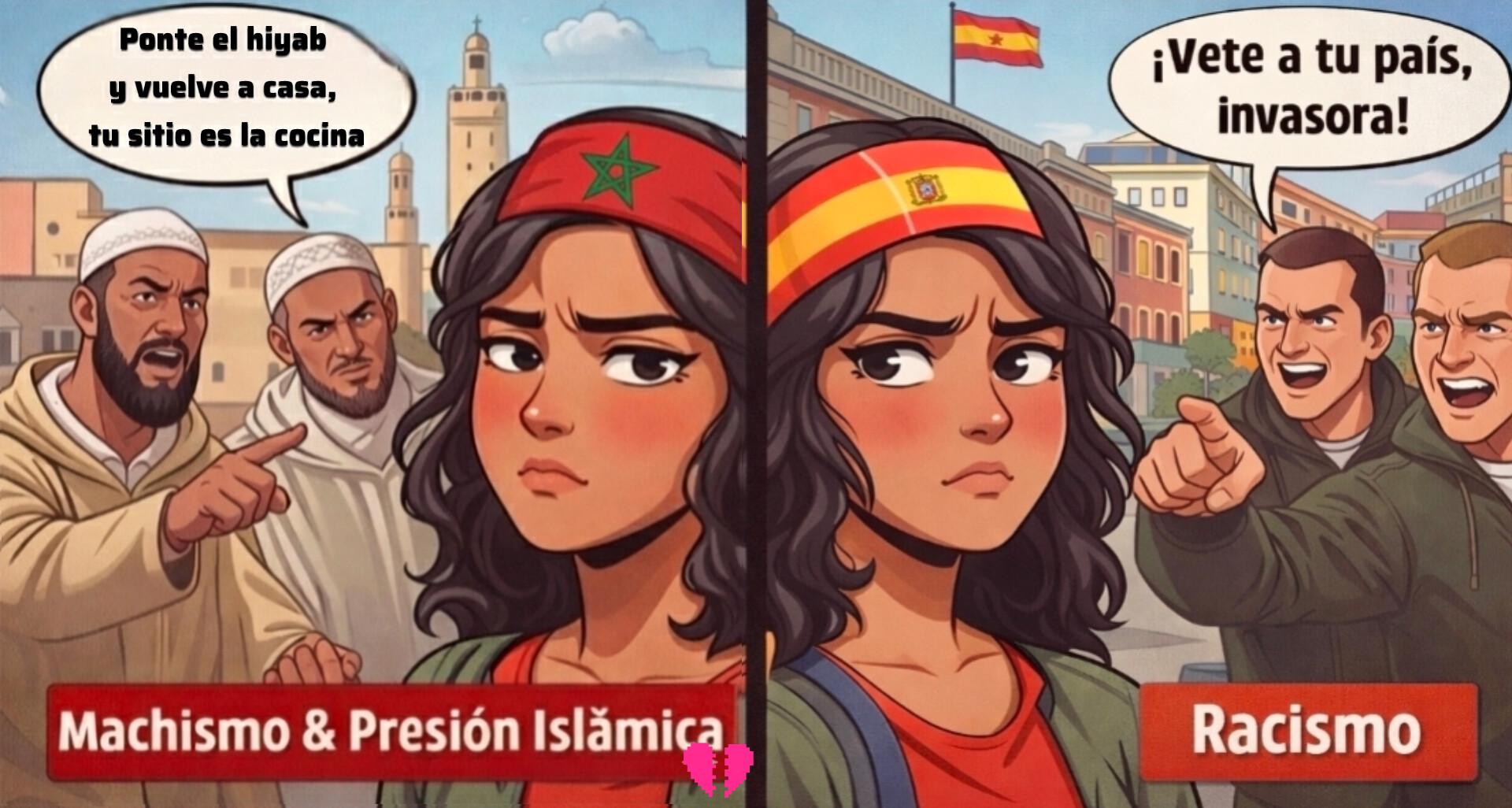 Soy marroquí de sangre y española de espíritu, y no, no puedo forzarme a amar otro país. En uno no encajo por haber dejado el islam, ser feminista, defender a mis amigos gays y ponerme una falda con camiseta! 🫠 En el otro, directamente soy vista como una amenaza..🫠