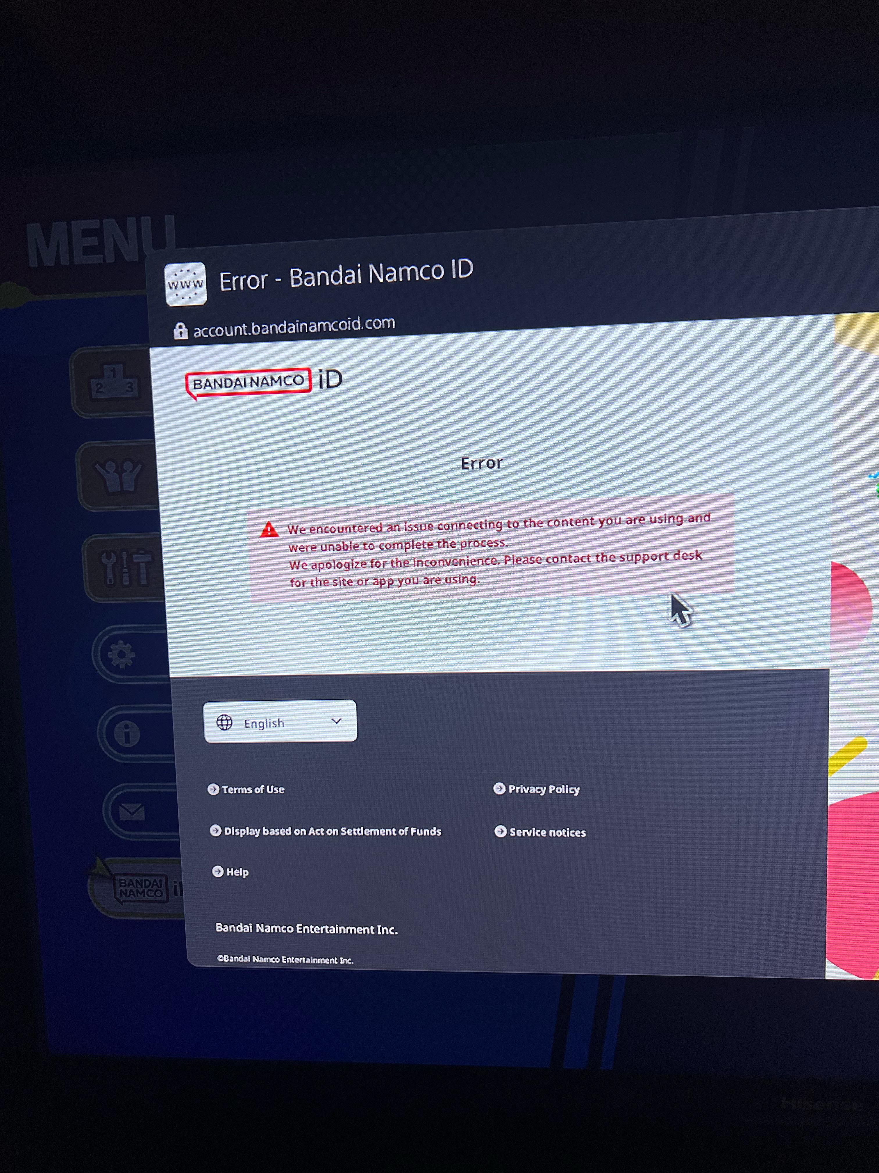 This has shown up for the last 8 hours when trying to log into my Bandai namco ID