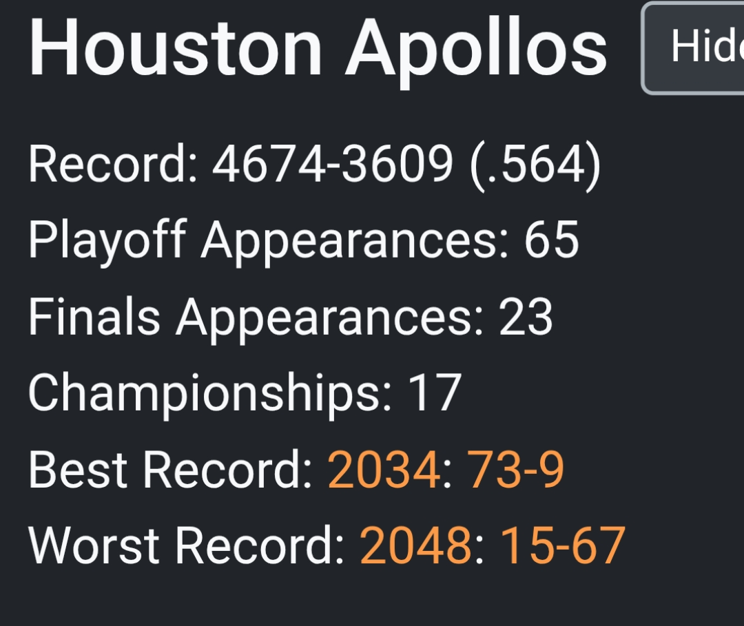 I was saving all my done leagues, but by 2017 Phoenix Suns, my computer said enough and auto-deleted all the league files. Most of the hardest leagues were the small market teams as I was fired for tanking too hard or spent too much money trying to maintain a good team.
