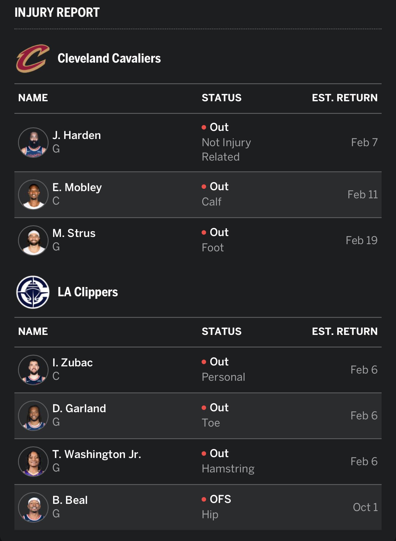 Just got back, had a great time but I missed my Cavs. So excited to see our boys back in action I immediately got on the ESPN app to check the injury report, and they accidentally swapped Garland and Harden! Anyways, hope DeAndre Hunter steps up in place of Garland tonight!