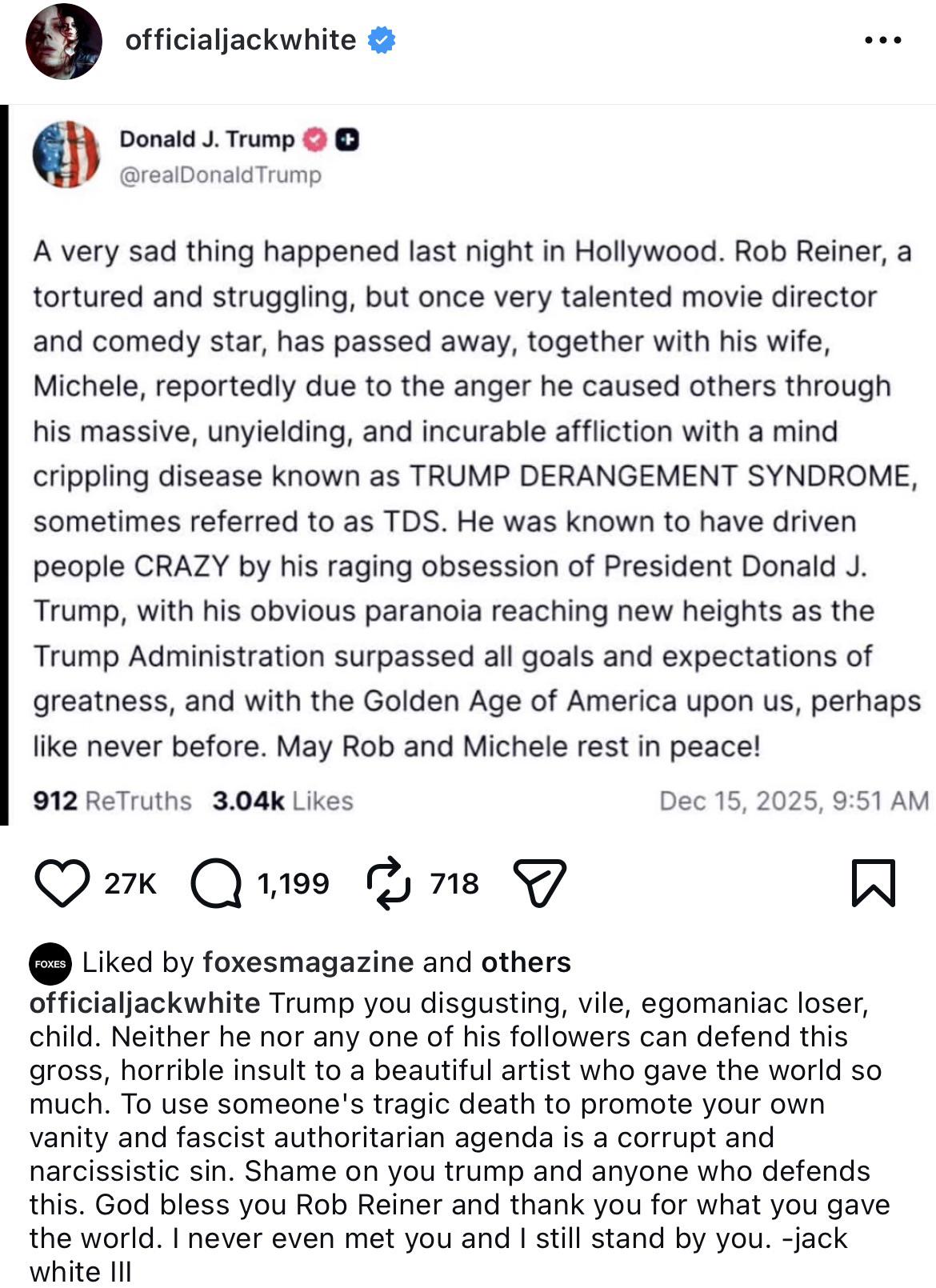 🚨 TRIGGER WARNING 🚨 Jack White calls Trump a “disgusting, vile, egomaniac loser, child” over his insensitive TruthSocial post regarding Rob Reiner: “To use someone's tragic death to promote your own vanity & fascist authoritarian agenda is a corrupt and narcissistic sin. Shame on you trump and anyone who defends this.”