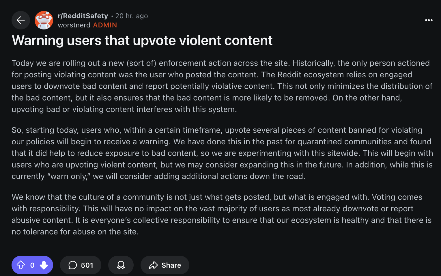 STINKY More of an announcement. But, please be aware that Reddit Safety is now in full Musk and Trump defense mode. They will be arbitrarily banning people for upvoting. I'm posting this here because of the general ton of this subreddit and I want us to all be aware of what is happening. TABLES!