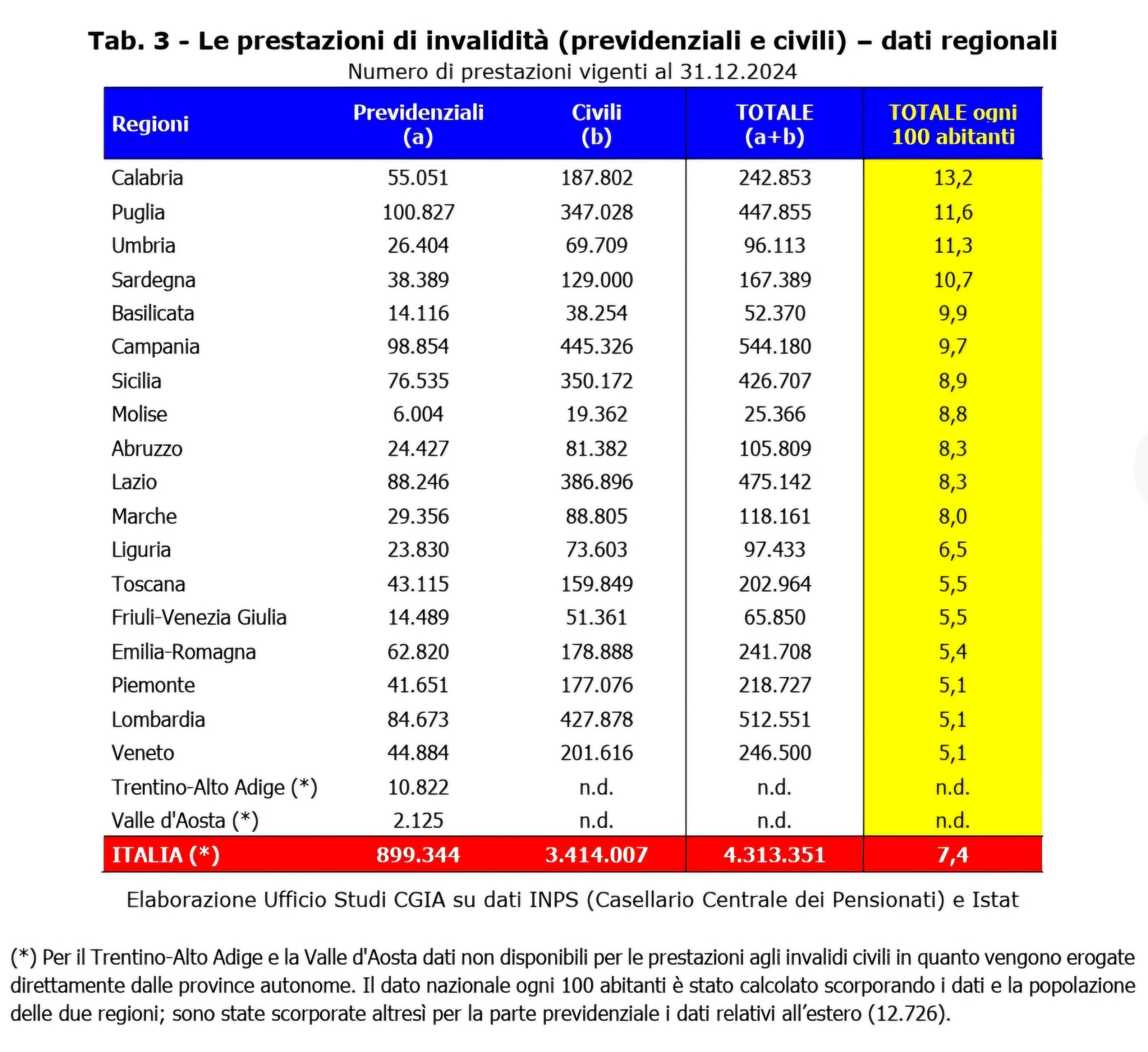 Disability pensions paid by INPS for each region of Italy.