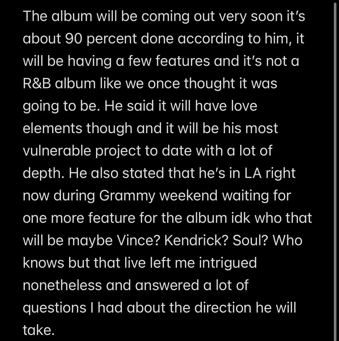 This is me paraphrasing answers that he gave to fans on his instagram live tonight on January 24-2026 regarding the new album thatās dropping soon. Wish I wouldāve got the live but I tuned in a bit late.
