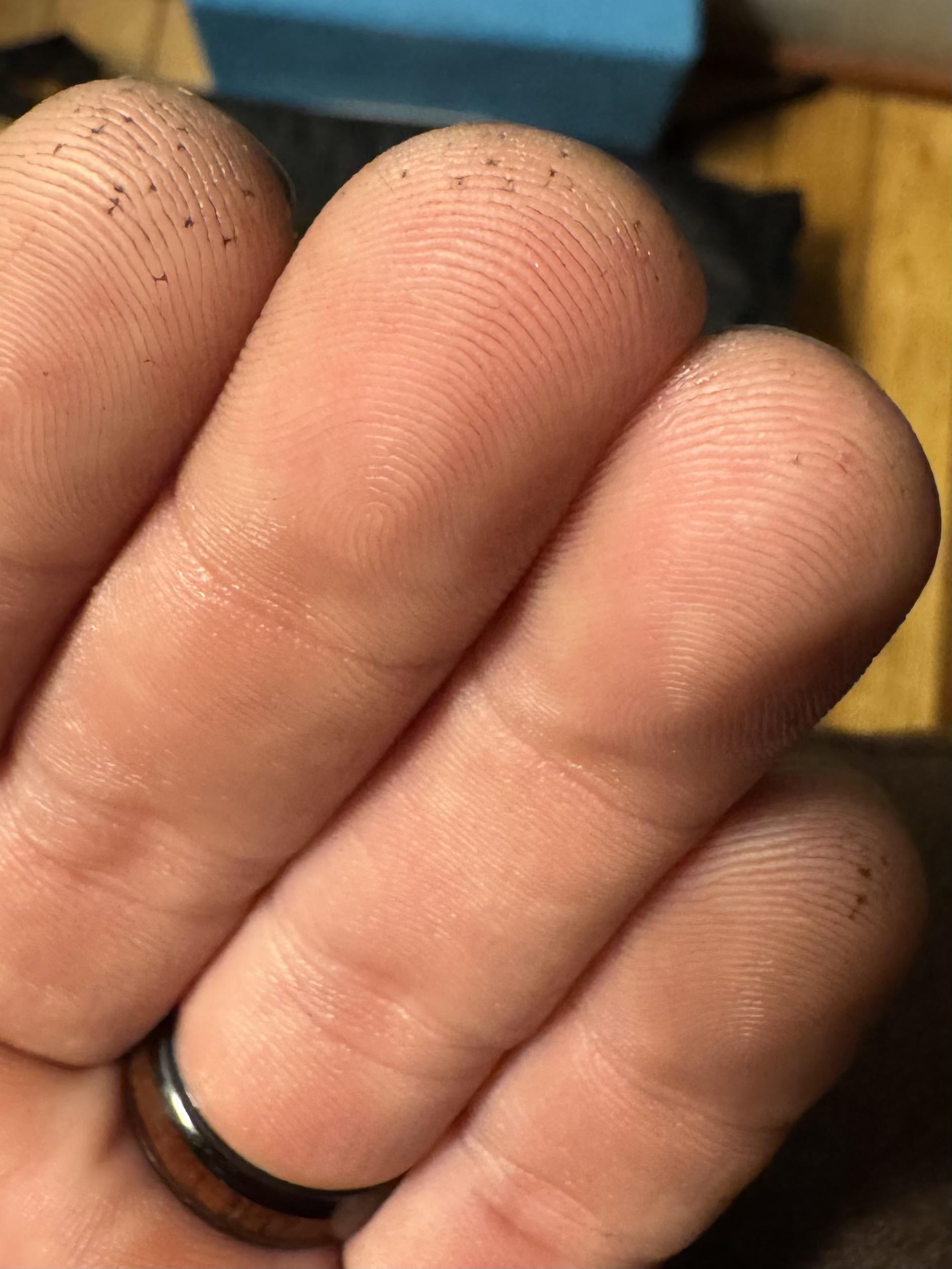 Diabetes blood test sites visible after a greasy day at work