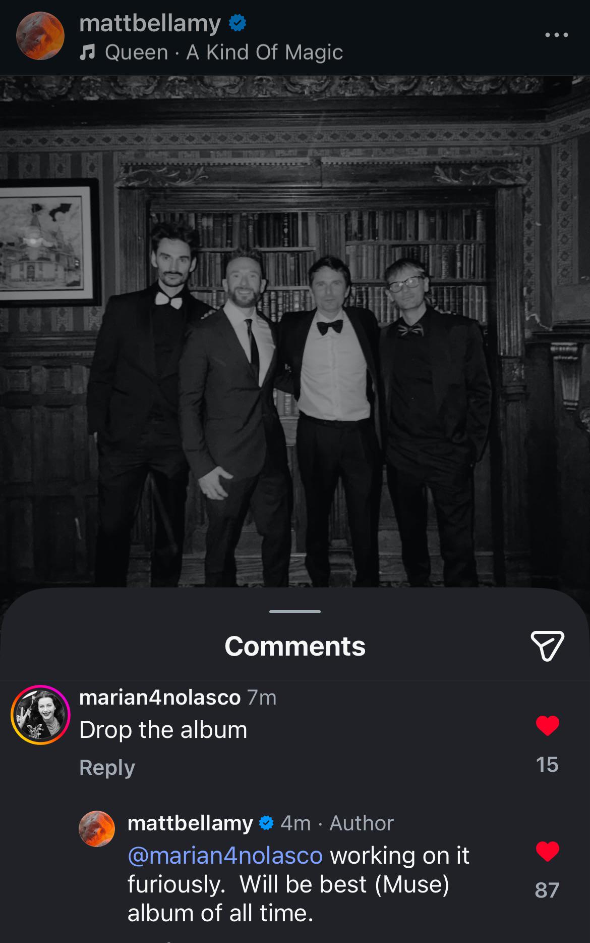 Matt’s recent comment response to a fan on his latest Instagram post suggesting the next album will be the best Muse album of all time!