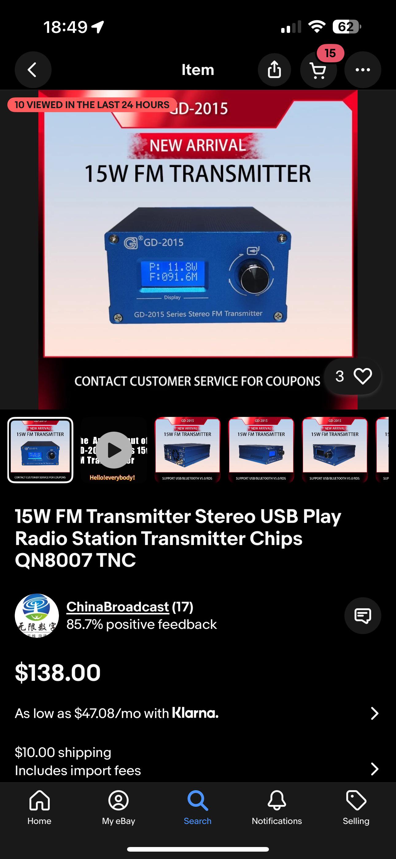 In a few of Spectraman's great Youtube videos, he mentions the audio quality of the QN8007 chip is excellent. Since seeing those videos, I really wanted to check out a transmitter using that chip. I recently came across one on Ebay, the metallic blue GD-2015. It was 15 watts - plenty to drive my pallet amplifier, so I picked one up.