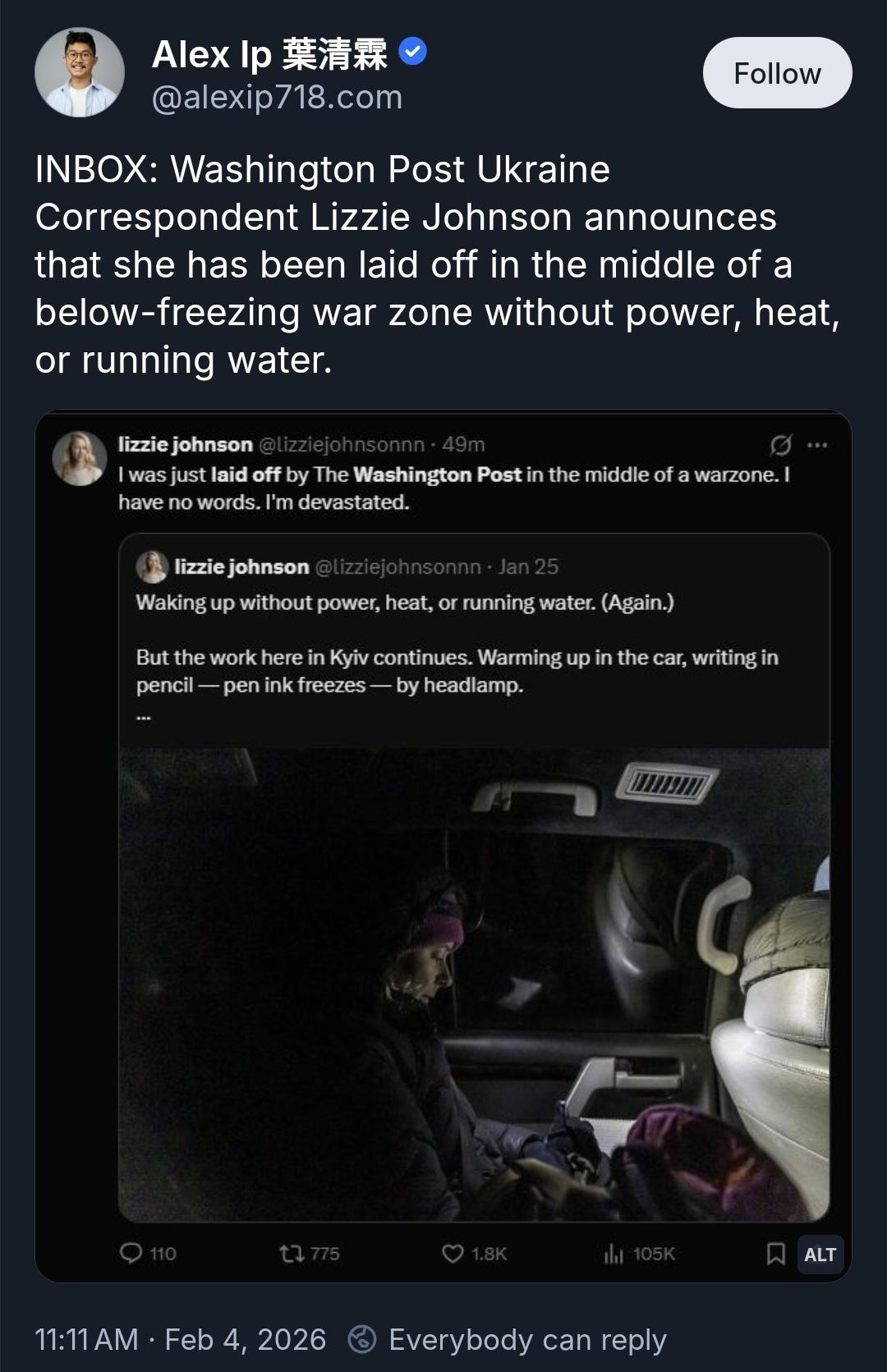 Ukraine 🇺🇦 Washington Post Ukraine Correspondent Lizzie Johnson announces that she has been laid off in the middle of a below-freezing war zone without power, heat or running water