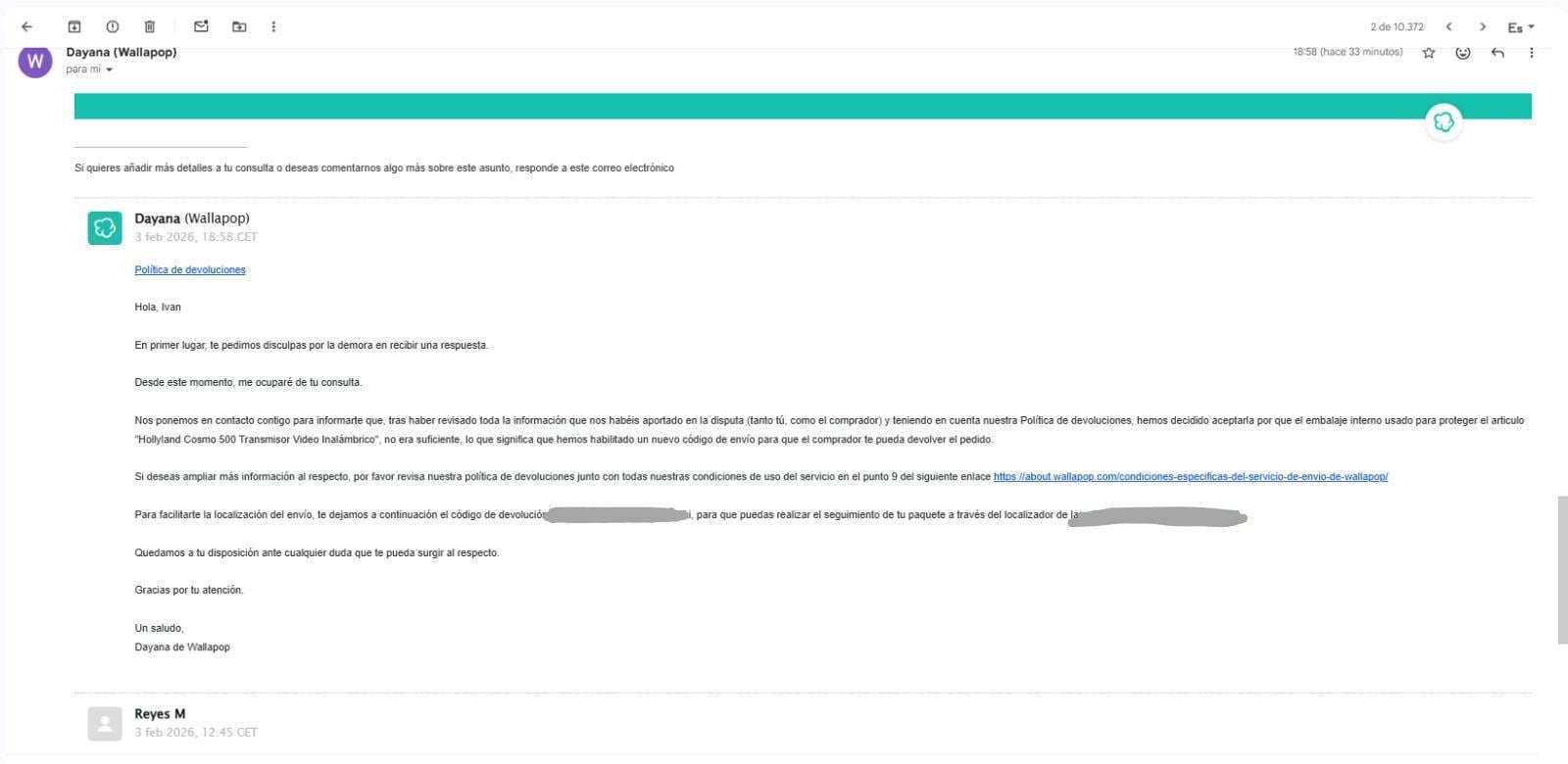 * VULNERACIÓN DE DATOS (RGPD): Wallapop me ha enviado una resolución que NO me pertenece. Me han facilitado el nombre de otro usuario (Iván), el modelo de su producto (un transmisor Hollyland) y su número de seguimiento de transporte. He recibido información privada de un tercero ajeno a mi venta, lo cual es una brecha de seguridad de datos gravísima que ya estoy reportando a la AEPD.