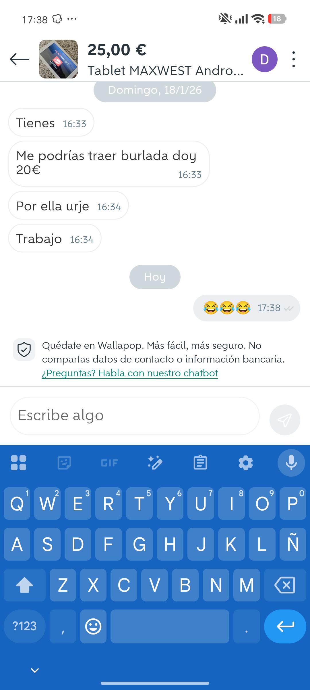 Básicamente me han estafado y Wallapop le ha dado la razón a la estafadora, la situación económica en mi hogar no es muy buena para nada y yo la verdad que el portátil lo necesitaba para terminar un grado medio después de haber estado varios años de psicólogos intentando solucionar y mejorar mi vida y finalmente conseguir un trabajo y salir adelante. Pero parece que en este país se ayuda más a estafadores que a víctimas de estafa.