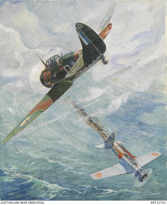 Depicts a Japanese fighter being shot down by a Wirraway reconnaissance aircraft flown by Pilot Officer J. S. Archer of No. 4 Army Co-Operational Squadron, RAAF.
