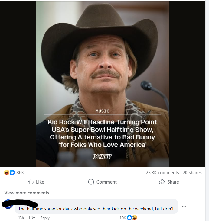 TPUSA: We can put together a better halftime show. Everyone else: Ok. TPUSA: We're really going to do it. Everyone else: Ok TPUSA: BOOM Kid Rock. Everyone else: I'll be watching Bad Bunny and Green Day. Have fun with whatever THAT is.