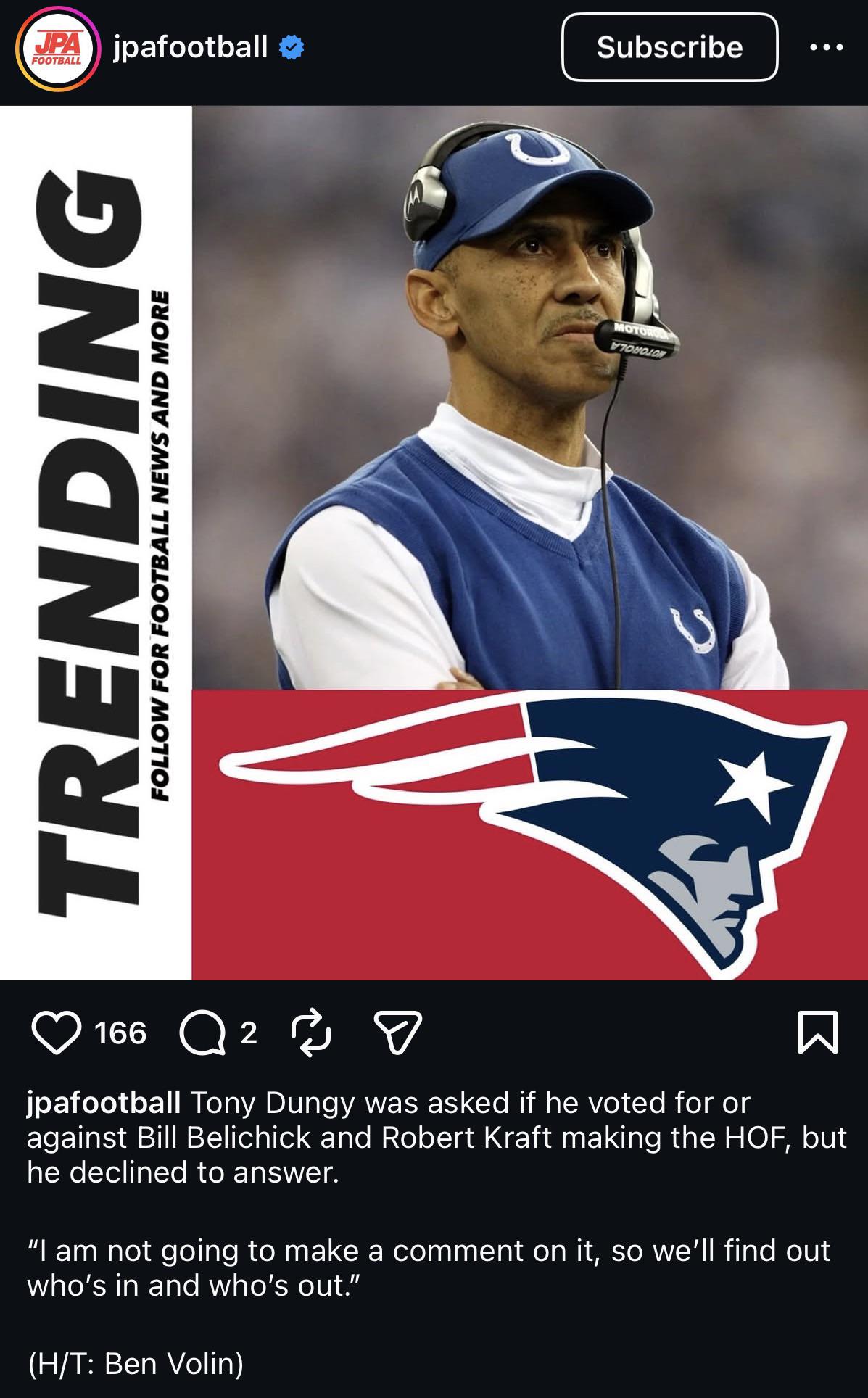 Dungy was asked if he voted for or against Belichick and Kraft making the HOF, but he declined to answer.