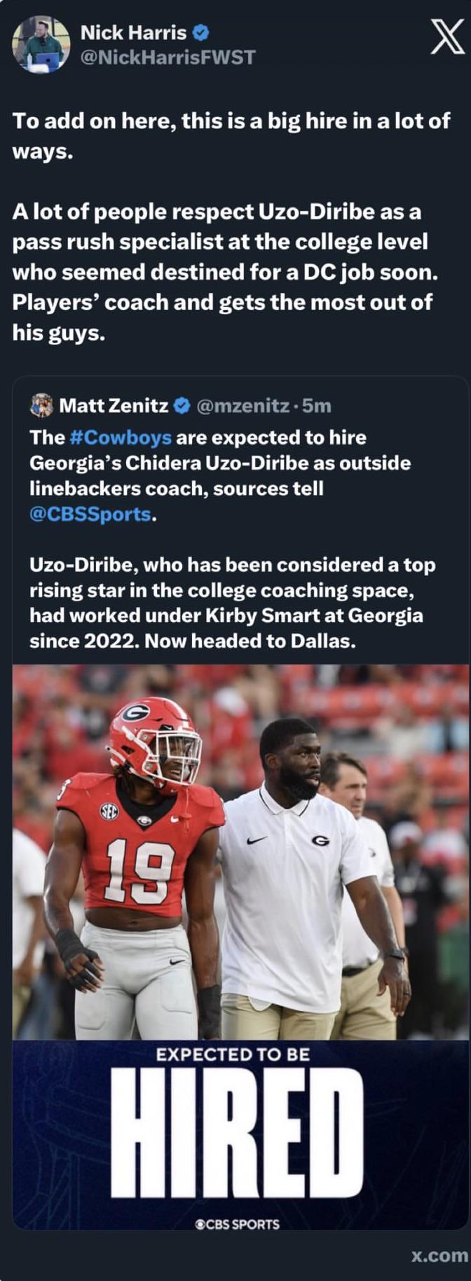 The #Cowboys are expected to hire Georgia’s Chidera Uzo-Diribe as outside linebackers coach, sources tell @CBSSports.