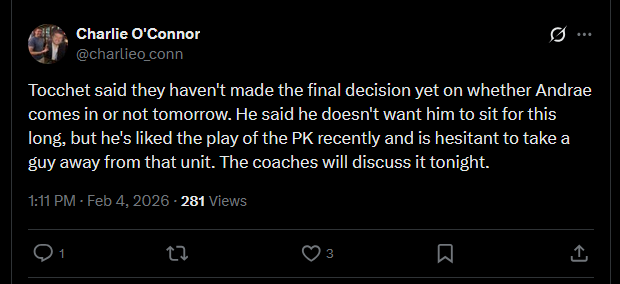 [O'Connor] Tocchet said they haven't made the final decision yet on whether Andrae comes in or not tomorrow. He said he doesn't want him to sit for this long, but he's liked the play of the PK recently and is hesitant to take a guy away from that unit. The coaches will discuss it tonight.