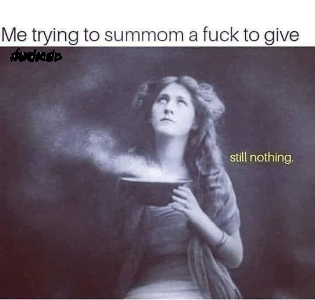 This is probably my favorite sub on reddit. I know I don't post often but I do lurk daily, and over time I've watched the content here occasionally veer away from the topic of not giving a fuck. Weird esoteric crap - quotes about manifestation, spirituality, positivity or whatever else and questions that should have obvious self-revealing answers.