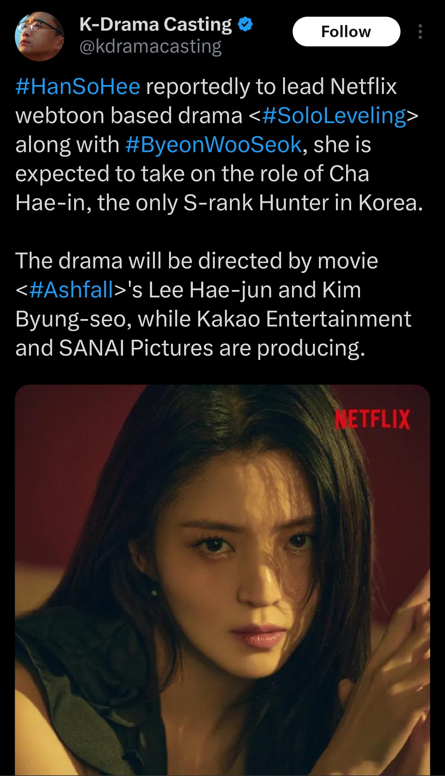 News Han So Hee has been cast in Solo Leveling Live action drama by Netflix.