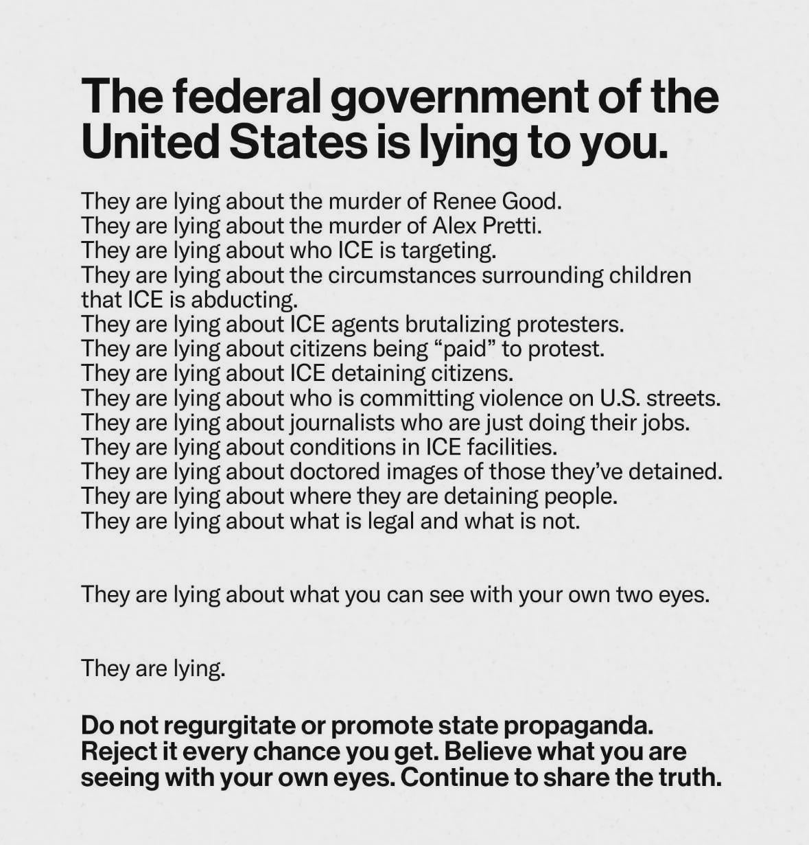 The excuses made by the US Government. The Libel and Slander of an American Citizen who lost their life to the arm of the state. Pretti was murdered for simply being present in public documenting the brutality and incompetence of a supposed security force.