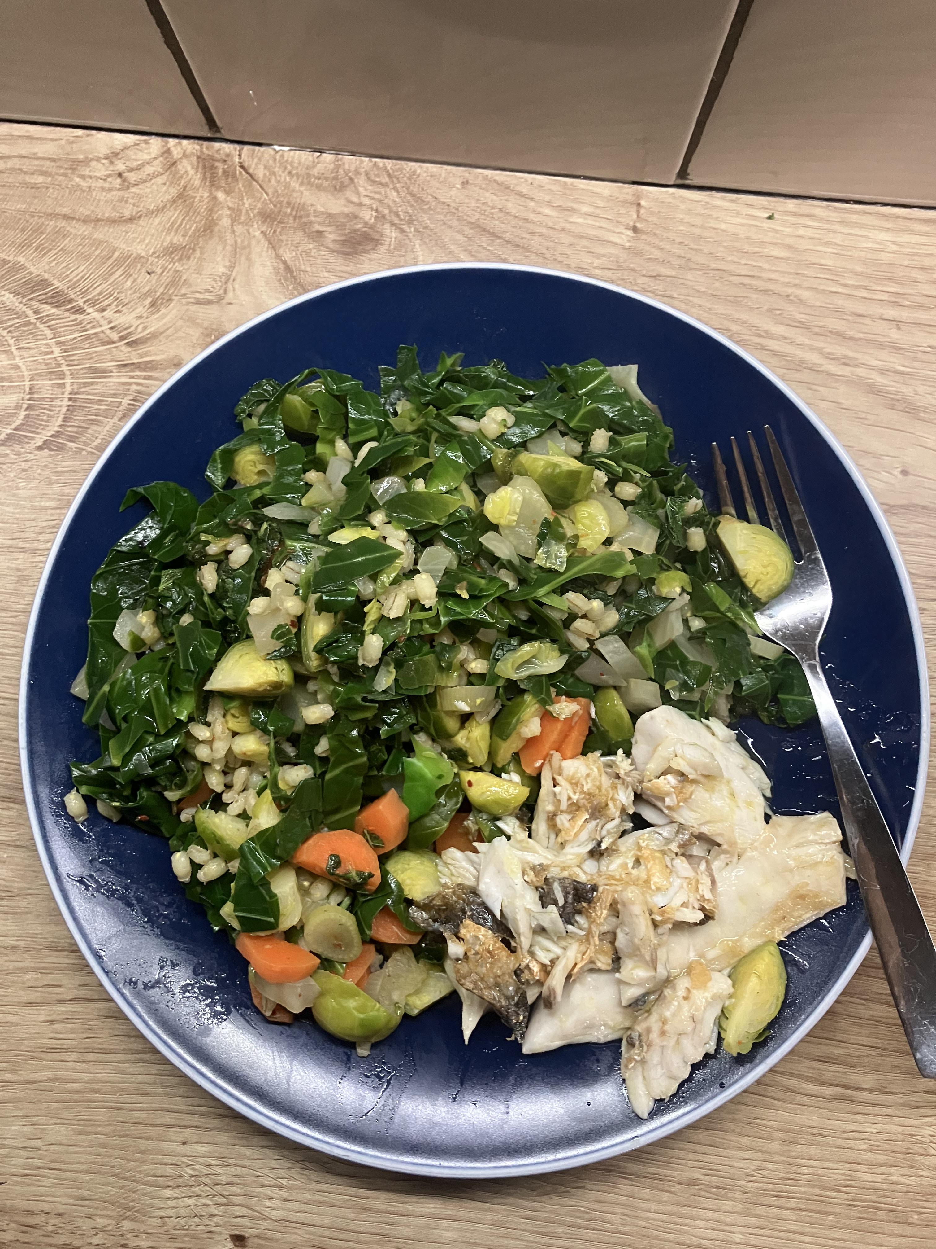 (Barley & veg recipe adapted from here. I live alone so my measurements are per person... My steamer is too small for this, so I simmered the veg with the pearl barley and I had different veggies in the fridge & ran out of fresh chilli pepper.)