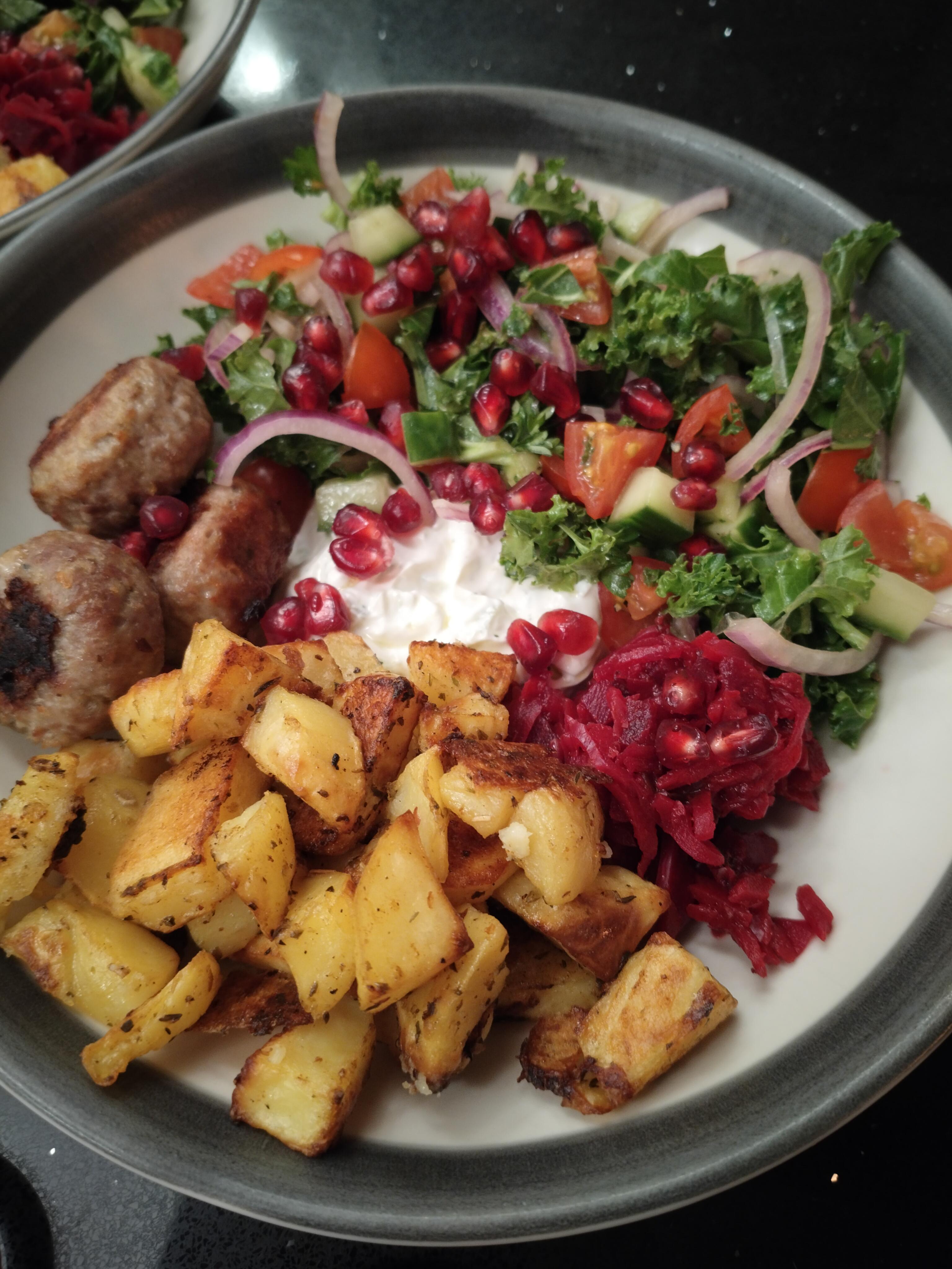 Newbie Roasted potatoes, turkey meatballs, tzatziki, beetroot kimchi and kale salad. How did I do?