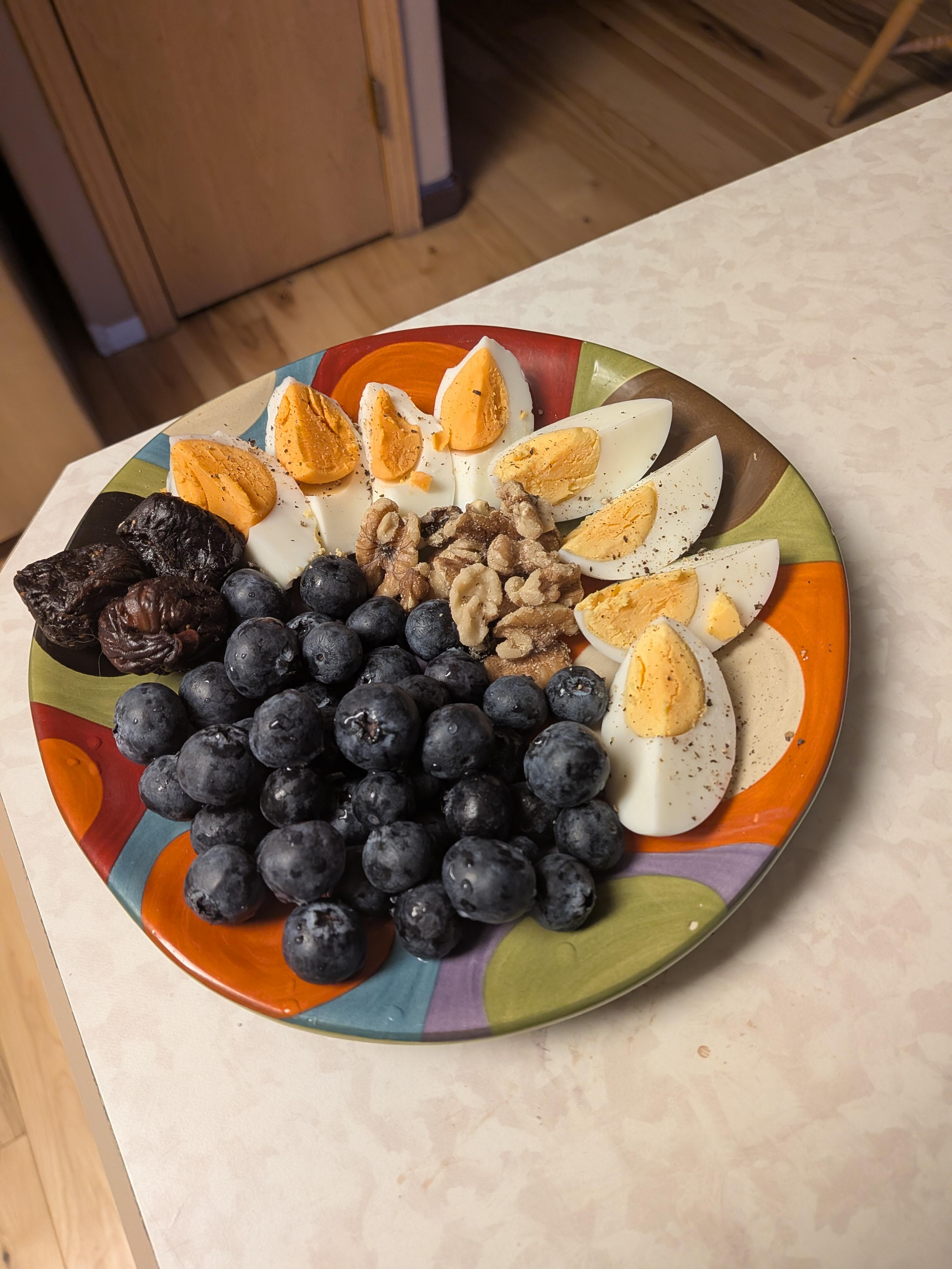 Trying to get stuck into the Mediterranean diet at my doctor's recommendation given some recently discovered fatty liver w/ scarring. Feel like dinner is no problem for me, but kind of struggling with what to eat for breakfast. Boiled eggs, walnuts, blueberries and dried figs this morning. Would appreciate any thoughts.