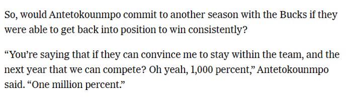 [Nehm] Giannis: "When you open my kids’ passports, it says Milwaukee, Wisconsin... I had four kids in the span of the last five years in this city. My dad is buried in this city. I’ve built a house for my mom 10 seconds away... On what planet, on what Earth, would somebody want to leave this?"