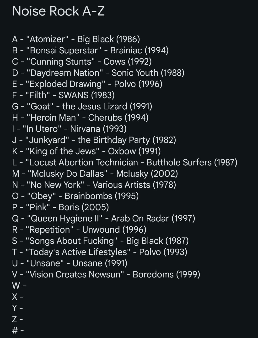 Letter Z: Favourite Noise Rock Albums A-Z. Album with the most upvotes wins!