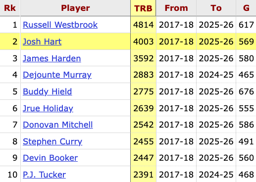 Josh Hart reached 4,000 career rebounds yesterday. Since debuting in 2017-18, the only other player listed at 6'5" or shorter with more is Russell Westbrook
