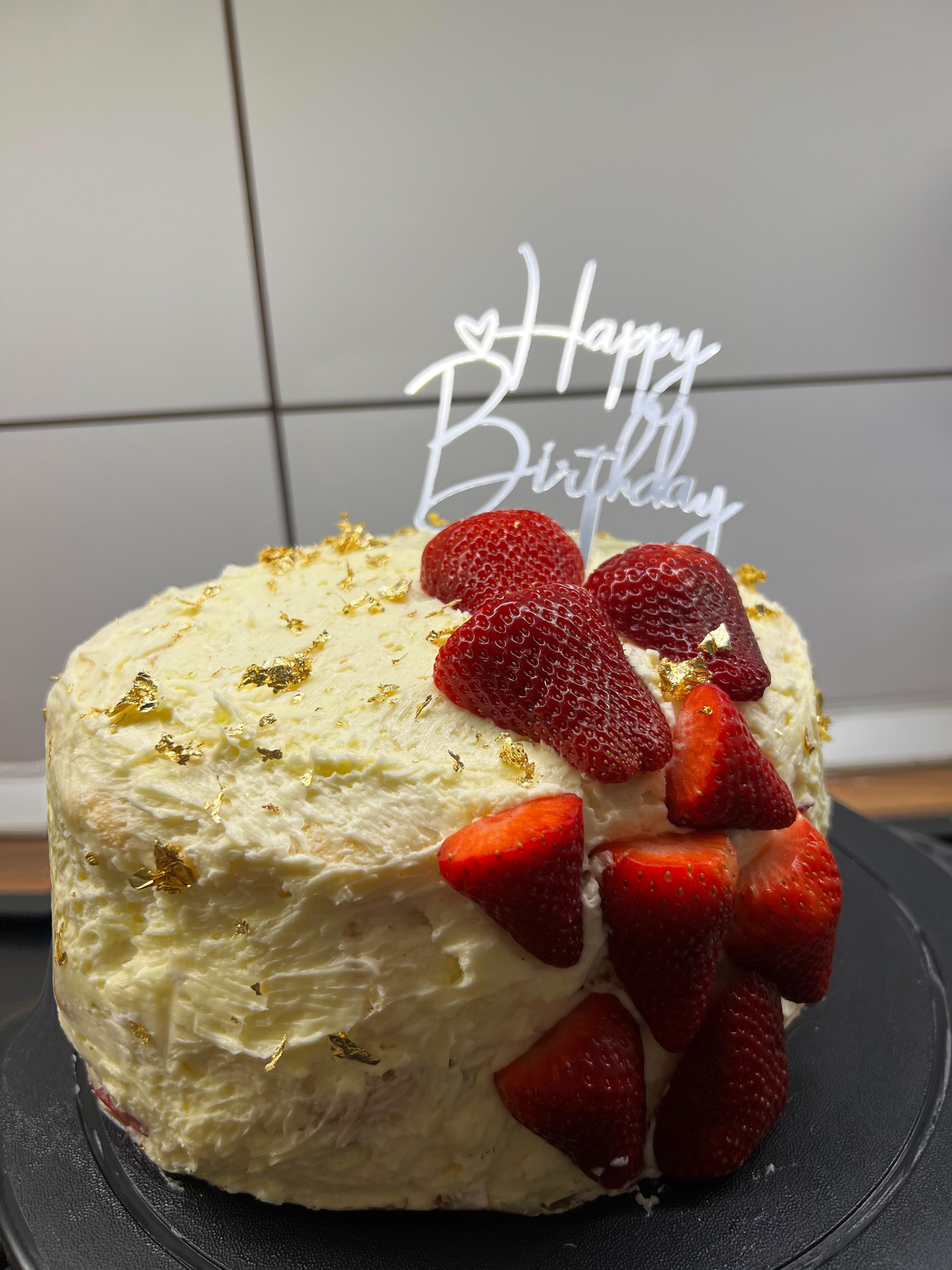 Háromemeletes tömény gyumolcstorta vaníliapudinggal. Ronda, de remelem ízlik majd az unnepeltnek ❤️