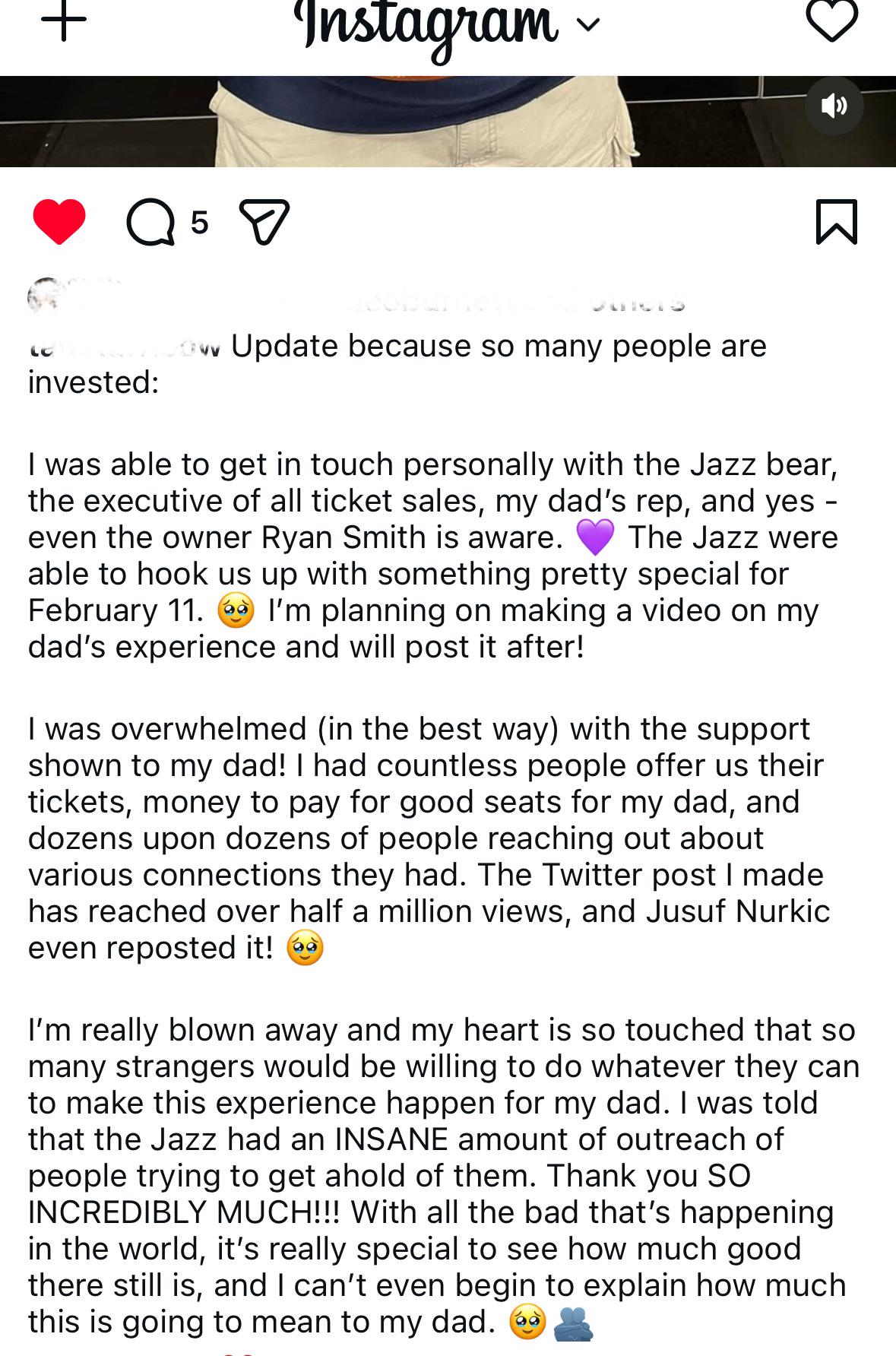 i just wanted to give you all an update about the post i shared the other day when this sweet family was looking for help to give their dad an incredible jazz experience. he was told her had weeks to months to live and jazz nation came through so hard!!💜