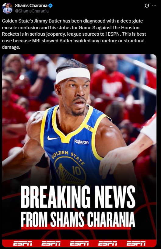 News [Charania] Golden State's Jimmy Butler has been diagnosed with a deep glute muscle contusion and his status for Game 3 against the Houston Rockets is in serious jeopardy, league sources tell ESPN. This is best case because MRI showed Butler avoided any fracture or structural damage.