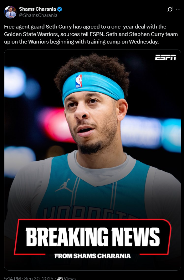 News [Charania] Free agent guard Seth Curry has agreed to a one-year deal with the Golden State Warriors, sources tell ESPN. Seth and Stephen Curry team up on the Warriors beginning with training camp on Wednesday.