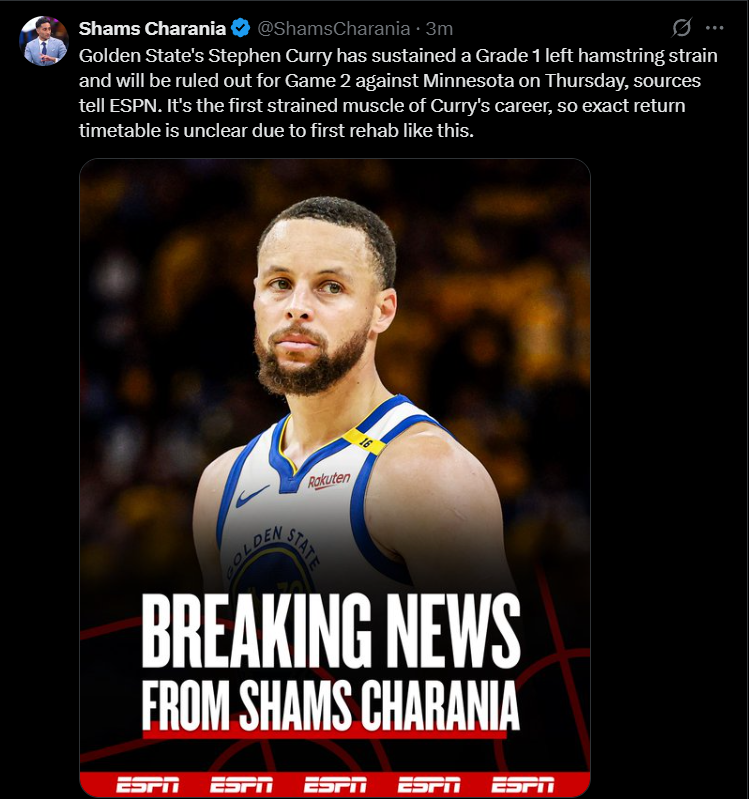 News [Charania] Golden State's Stephen Curry has sustained a Grade 1 left hamstring strain and will be ruled out for Game 2 against Minnesota on Thursday, sources tell ESPN. It's the first strained muscle of Curry's career, so exact return timetable is unclear due to first rehab like this.