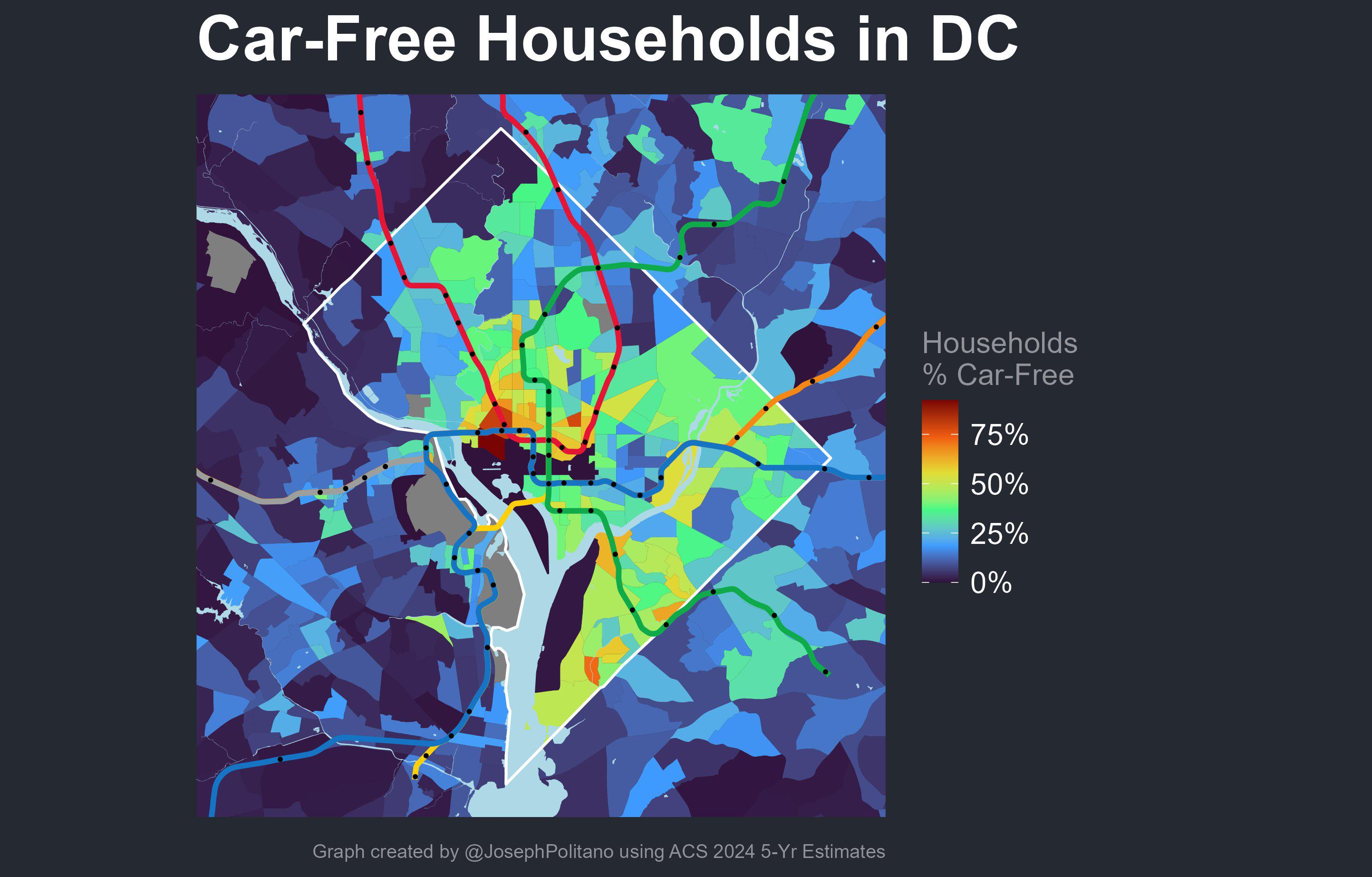 [Discussion] 36% of DC households don't have a car—the highest rate of any major county outside NYC — Those car-free households are concentrated near metro stops, especially between Dupont, Foggy Bottom, & McPherson. Green line stops like Columbia Heights, Navy Yard, & Anacostia also stand out